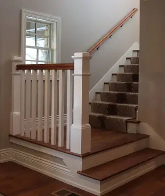 The Stair Parts Now stair system used in the home is a square balustrade system painted in white with box newels. A plowed handrail with fillet in hickory complements the wood flooring on the staircase.
