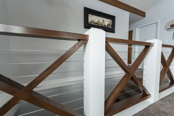 With the design in hand, Mohlman installed the cable system on the stairway. A past builder with finish work experience, he next painted and lacquered the wood pieces. The Stair Parts Now cable system was installed on the back side of an "X" arrangements created by the wood pieces.