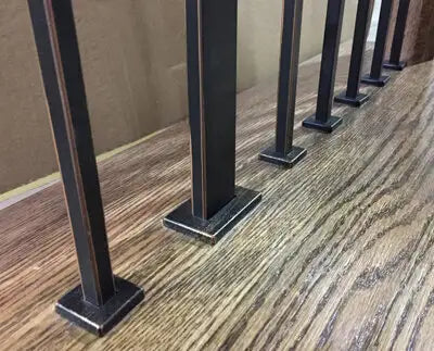The ½” x 1 ½” rectangular shoe design was created for our Contempo Flat Bar baluster (LIH-HOL166444) and is available in Low Sheen Black, Matte Nickel, Satin Black and Oil Rubbed Copper. The square shoe style is designed for our plain bar baluster (LIH-HOLPLA44) or any of our ½” square balusters and is available in Low Sheen Black, Matte Nickel, Satin Black, Oil Rubbed Copper and Oil Rubbed Bronze. You can pair these shoes and balusters to create many unique patterns.